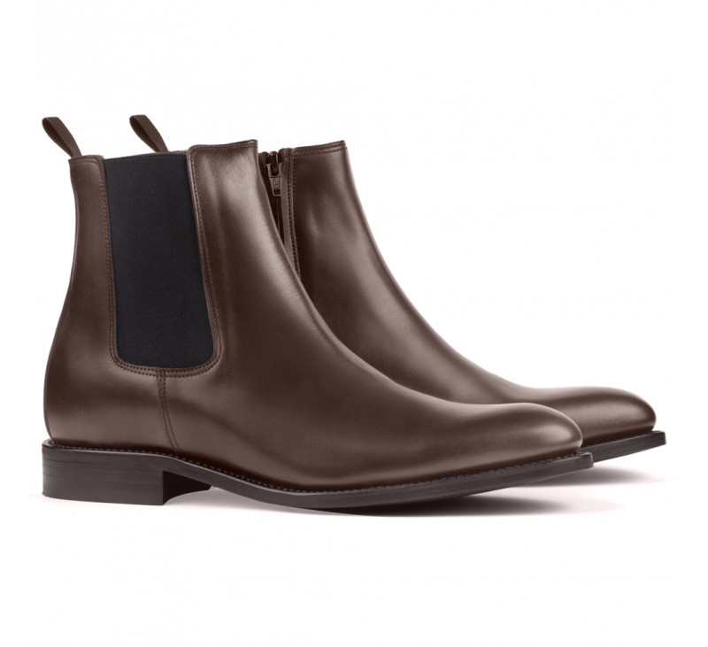 Flavio. Stivali con rialzo di qualità Goodyear-welt. Goodyear-welt è la denominazione internazionale di un particolare tipo di scarpe. È la migliore calzatura disponibile sul mercato e, sebbene il suo particolare sistema di lavorazione lo renda più rigido quando è nuovo, è concepito per offrire totale comfort e cura per i piedi. Si tratta di una garanzia di lavoro artigianale in quanto prodotto che può essere prodotto solo a mano e nel quale si utilizzano materie prime di qualità superiore. È adatto a vestire e abbinare abiti o costumi da sport. La sua suola in cuoio e tacco rinforzato in gomma ne accentuano l'eleganza. Si raccomanda di pulire gli stivali che sollevano l'altezza con crema e un panno asciutto o una spazzola trasparente strofinando delicatamente. Si può finire con una spugna lucidante.